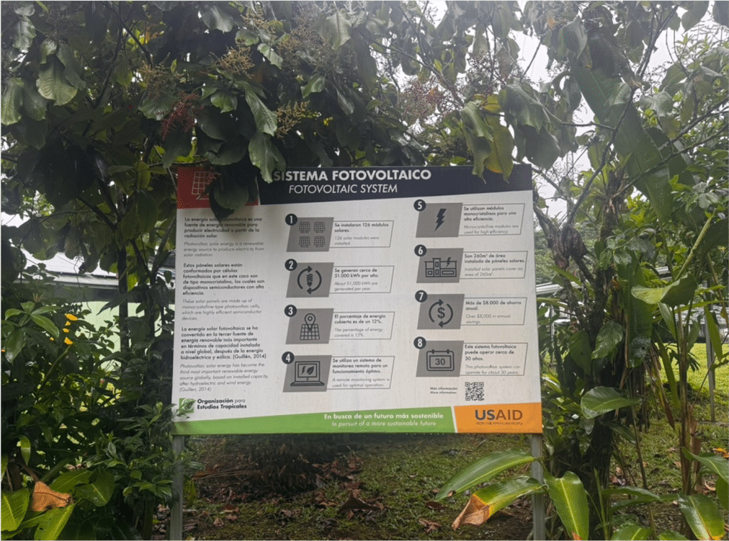 Con la ayuda de USAID, La Selva pudo implementar un proyecto de paneles solares en fases para alimentar las áreas principales de la estación, promoviendo la energía limpia a través de la reducción del uso de carbono y combustible.